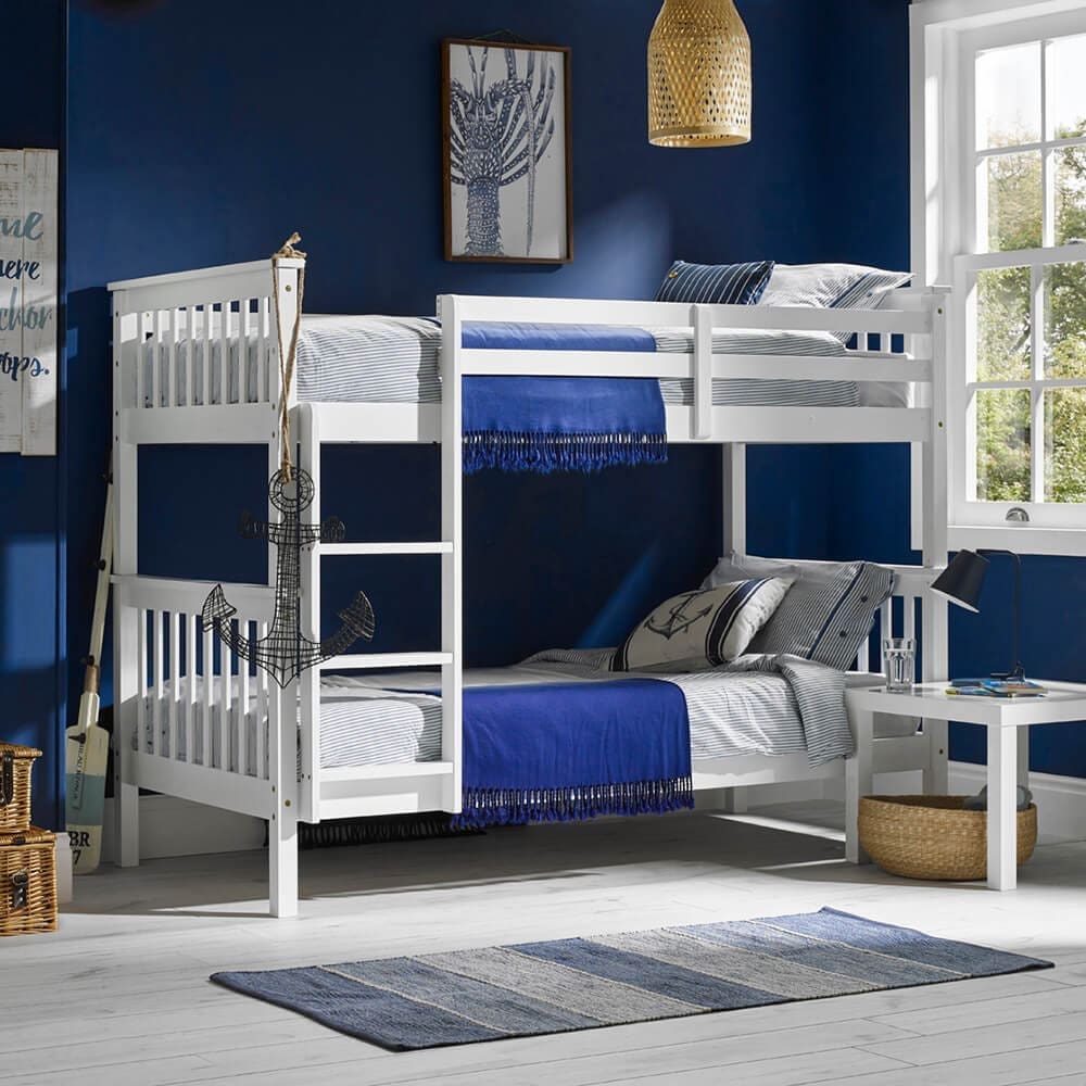 Simply designed in a sturdy, almost shaker style, the Leo Bunk Bed is the ultimate in practical sleep systems. Comprised of 2 beautifully shaped single beds with a stunning slatted head and foot board, these solid beds can be combined into bunks and can also be split into 2 separate standard single beds. Finished in a classic Solid Off White Colour, the Leo Bed system is ideal for providing all the sleeping space you need for a busy family.