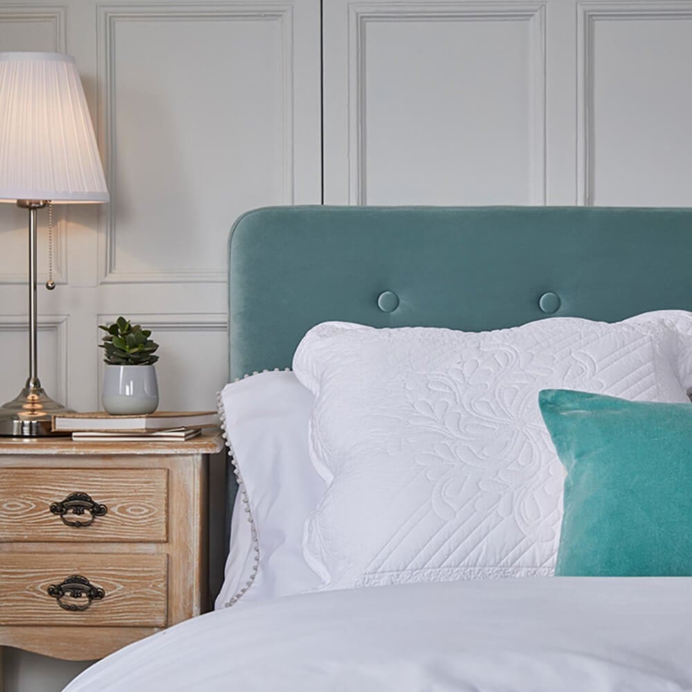 The Pierre Bed is a simple yet stylish soft, velvet aqua upholstered bed with contrasting light wooden legs and a classic button detail to the headboard. Elegantly clad in the same aqua upholstery as the headboard, the frame and footboard is inviting and sumptuous. Characterising a relaxing and calm environment, this bed is delicious in its design and will make any bedroom into a stunning boudoir with its addition.