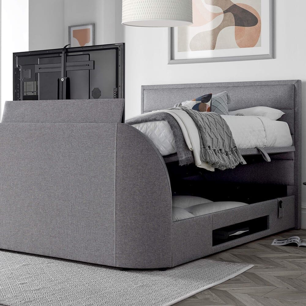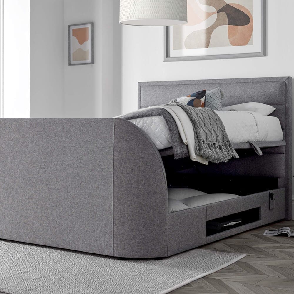 The Salvador TV Ottoman encapsulates modern design with its slim border and horizontal stitch padded headend, offering a sleek and contemporary look for any bedroom. The bed’s design includes a slim footend that ingeniously conceals up to a 43″ TV, seamlessly integrating entertainment into your personal space without sacrificing style or comfort.