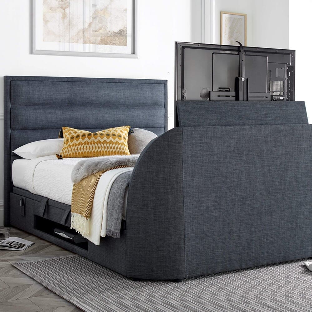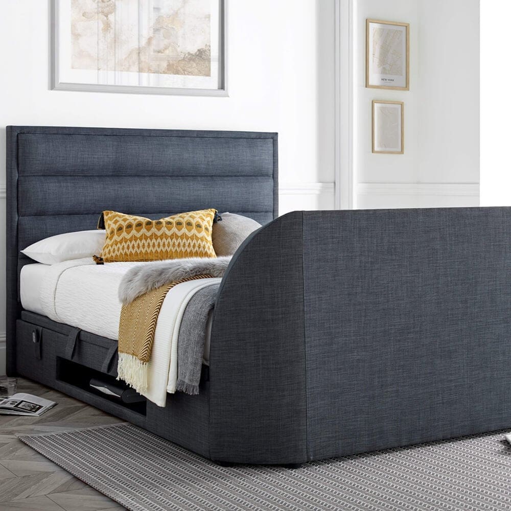 The Salvador TV Ottoman encapsulates modern design with its slim border and horizontal stitch padded headend, offering a sleek and contemporary look for any bedroom. The bed’s design includes a slim footend that ingeniously conceals up to a 43″ TV, seamlessly integrating entertainment into your personal space without sacrificing style or comfort.