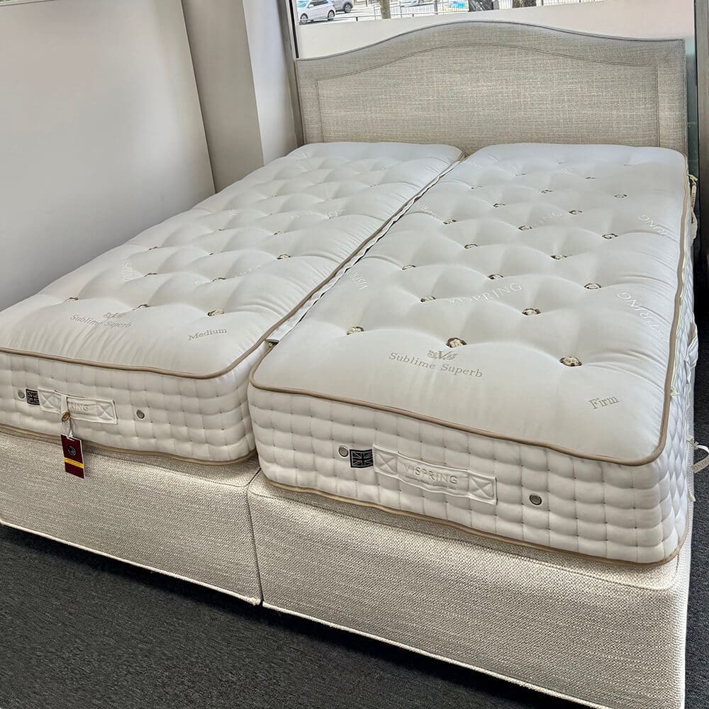 Vispring Sublime Superb Divan Set Zip & Link With Artemis Headboard Ex Display – Medium / Firm Tension – Fabric: Boucle 2150 Sandstone